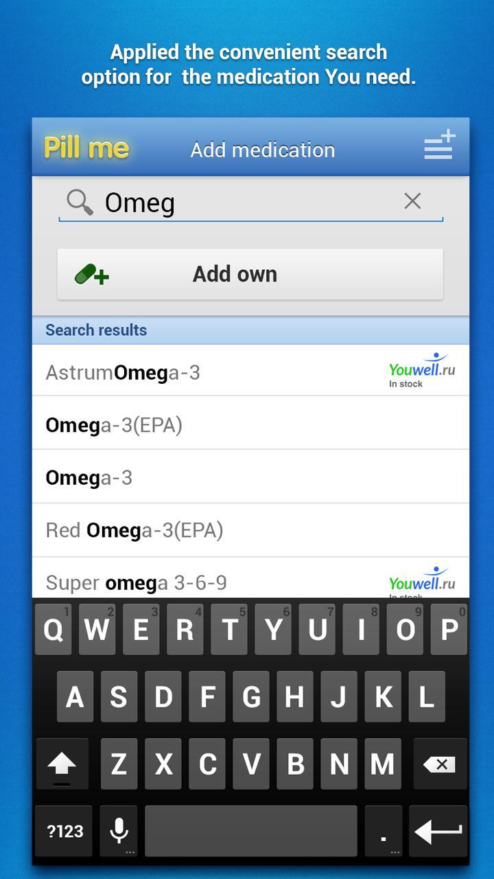 While making an individual schedule you can choose the medications from the list using the quick and convenient search option or to add your own medications.