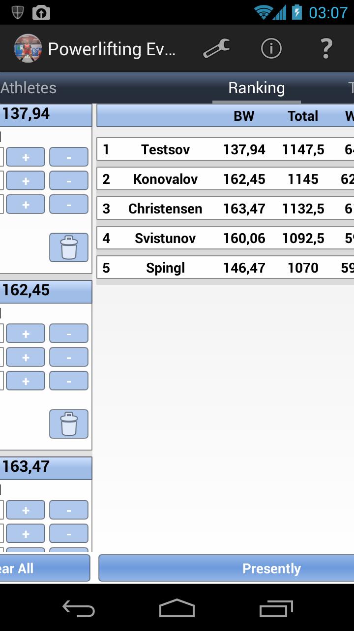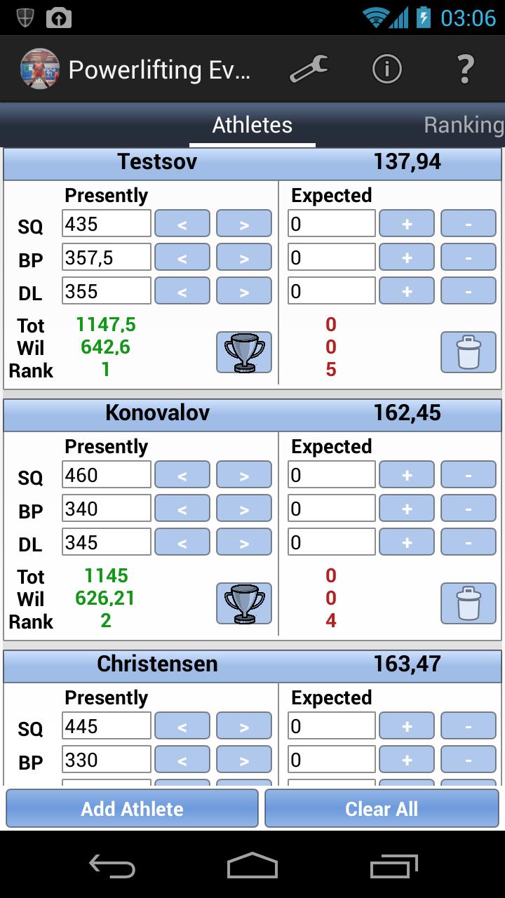 Designed to help the individual athlete or coach in planning a strategy, and calculations for Powerlifting Competitions.