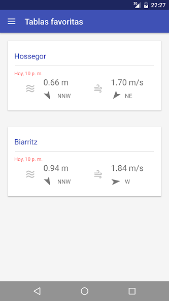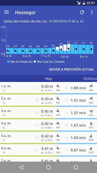 Prediction of height, wave period and direction for different points along the coast and offshore tables provided by the State Ports Port (Spain). Scope 3 days. Includes forecasts of waves and local winds