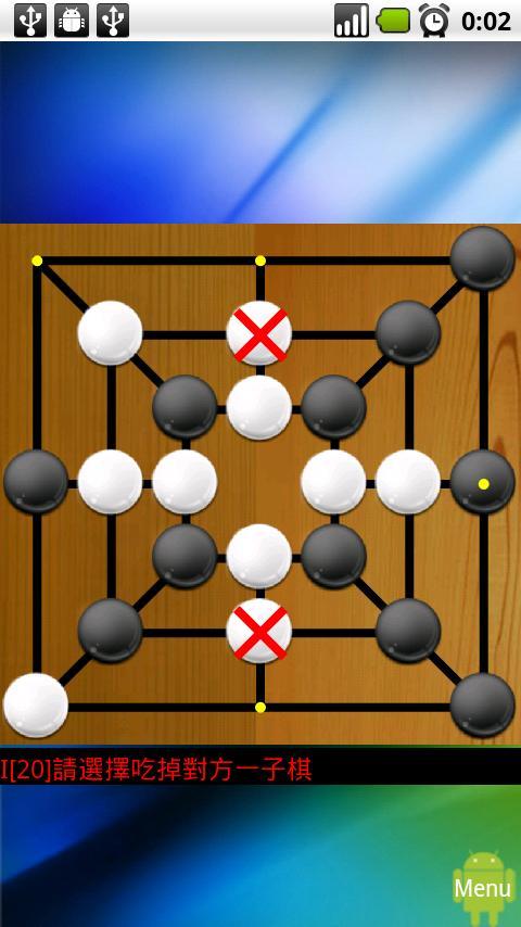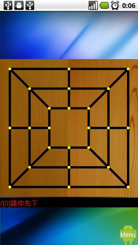 Cada jogador começa com nove doze peças ("homens"). No início do jogo, não há peças no tabuleiro. As peças podem descansar em qualquer ponto no tabuleiro, onde as linhas se cruzam. O objetivo do jogo é capturar todas as peças do oponente.