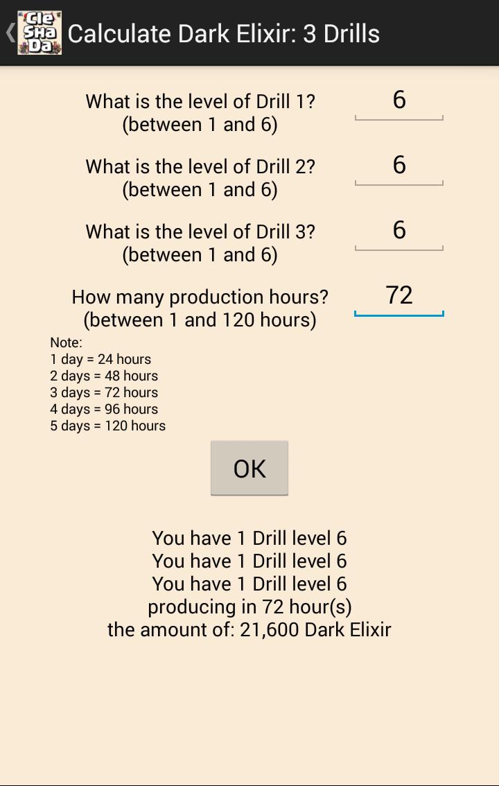 Calcule a produção de ouro, elixir e elixir escuro, dependendo do tempo: onde você pode calcular a produção de ouro, elixir e elixir escuro, dependendo do tempo escolhido, por exemplo: uma mina de ouro de nível 9 produz como ouro em 24 horas? A resposta que você pode encontrar no aplicativo.