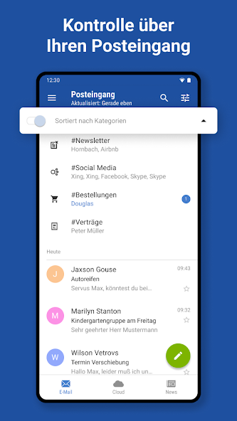 O envio e o recebimento de emails deve ser o mais fácil possível, e é essa facilidade de uso que foi fornecida no design do aplicativo GMX Mail. Independentemente do seu provedor, colete todas as suas contas de email em um único local. Navegar e gerenciar e -mails é uma tarefa simples com o uso de gestos de deslizamento, e seu catálogo de endereços, caixa de entrada e outras pastas nunca estão a mais de um clique de distância. A economia de anexos é fácil e permitirá que você os mantenha à mão para uso posterior.