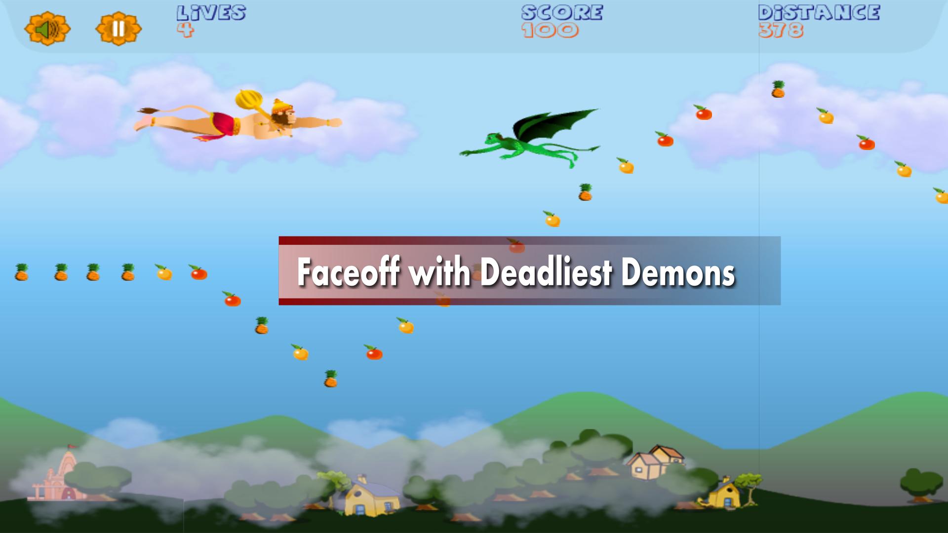 Um herói guerreiro, uma encarnação de Deus, um salvador, avatar icônico, o Hanuman o levará aos tempos antigos, em que você como jogador terá que ajudar nosso herói a alcançar sua marca ininterrupta, evitando os obstáculos dos demônios.