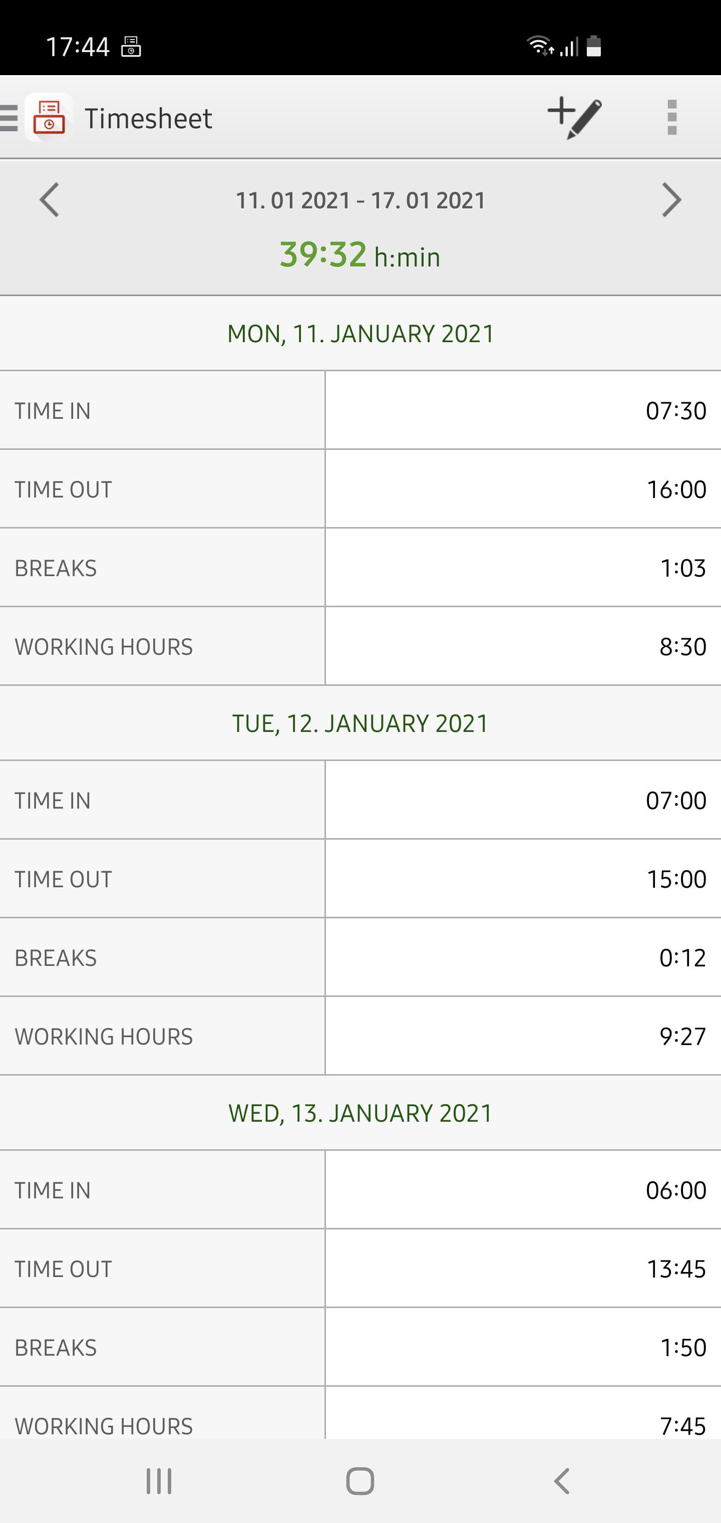- quadro de horários semanal com início, fim, quebras e duração do seu horário de trabalho