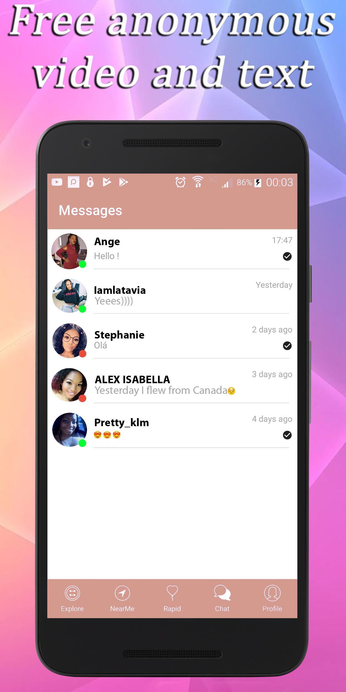 Random Dating is anonymous random chat app to meet new people. Just start one on one chat with a single tap. Very Simple!