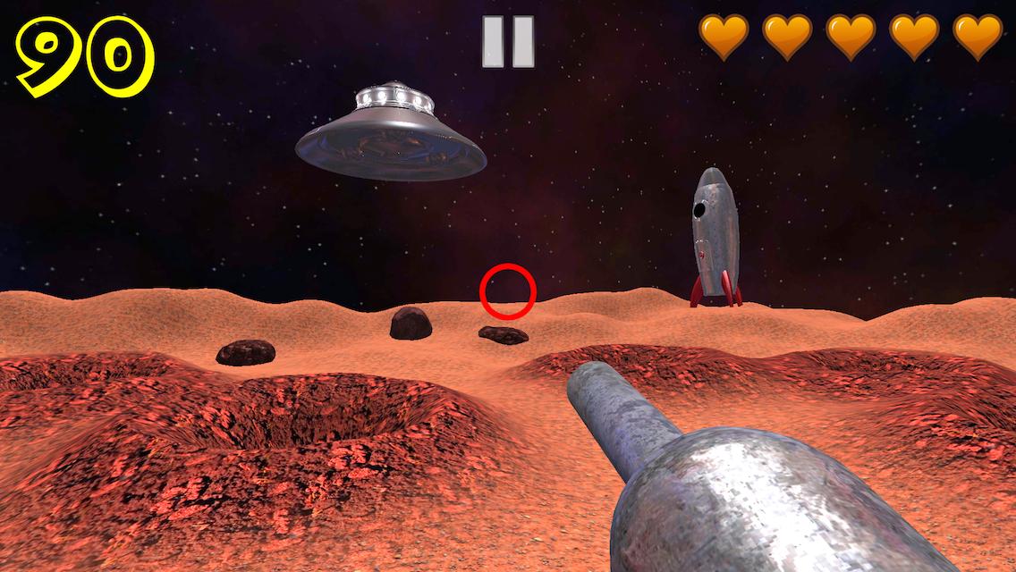 Управление по умолчанию для игры используют гироскоп вашего устройства. Поэтому, чтобы сыграть в игру, вы можете либо встать, либо сесть на поворотное кресло с устройством, удерживаемым перед вами. Затем вы можете повернуть на 360 градусов, чтобы увидеть все отверстия инопланетян, окружающие вас, и когда кто -то появляется, нацелитесь на красный круг в центре и поставьте в любом месте на экране, чтобы стрелять.
