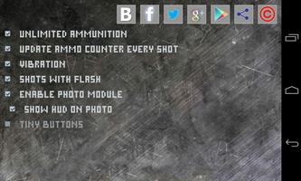 Чтобы измениться между типами оружия, вам просто нужно провести на экране слева направо или справа налево. Чтобы измениться между оружием: проведите снизу вверх или сверху вниз. Каждый раз, когда вы меняете оружие в левом углу, вы увидите индикатор текущего выбранного оружия. Прикоснувшись к этому индикатору, вы можете получить доступ к «карте оружия», когда у вас есть возможность изменить оружие, нажав на него. Вы можете снимать, касаясь кнопки Target в правой центре экрана, если вы хотите перезагрузить кнопку Touch Circle с оружием в правой части экрана (счетчики доступных боеприпасов в этом углу). Если вы в темной комнате, вы можете включить фонарик. Вы можете корректировать эффекты выстрела, касаясь AIM в центре экрана. Будет открытое меню настройки эффектов, где вы можете: ВКЛ/OFF Sparks, Muzle Flash и кровь. Чтобы выйти из этого меню, просто нажмите вне кнопок. Вы можете сфотографировать или видео в любой момент игры, коснувшись кнопки камеры в левой стороне экрана. Чтобы измениться между фото и режимом видео, просто коснитесь значка фото/видео над кнопкой захвата. Когда вы находитесь в режиме фото, простой ProgressBar указывает на обработку сочетания фотографии и будет иметь хит, когда она закончится. Если вы находитесь в режиме видео, вам нужно подождать, пока не будет выполнено весь процесс. В то время как Video Module готовит видео, вы можете включить в режим фото и сделать фотографии. Вы можете сразу же управлять фотографиями в встроенной галерее (доступ к ней из главного меню). В галерее вы можете просмотреть, удалять или делиться фотографиями через: Allshare, Bluetooth, Cymera, Drive, Email, Facebook, Gmail, Google+, Instagram, сообщения, редактор фото, Picasa, Social Hub, Twitter, WhatsApp, Wi-Fi Direct и любая другая служба социальных счетов или обмена сообщениями, которые вы установили на своем устройстве. Нажмите и удерживайте фото или видео, чтобы выбрать его, если хотите удалить его. В меню «Параметры» вы можете настроить размер кнопок в игре, вибрации включения/выключения, установить для рисования кнопок или скрыть ее в момент захвата фото, увеличить немного производительности для медленных телефонов, и вы можете найти полную информацию о Armed Cam и Shunamicode, поделиться игрой, читать режима и включить режим Howto. Прикоснувшись к «статистике», вы можете проверить, сколько пуль вы снимаете, поделитесь ею и другими вещами.