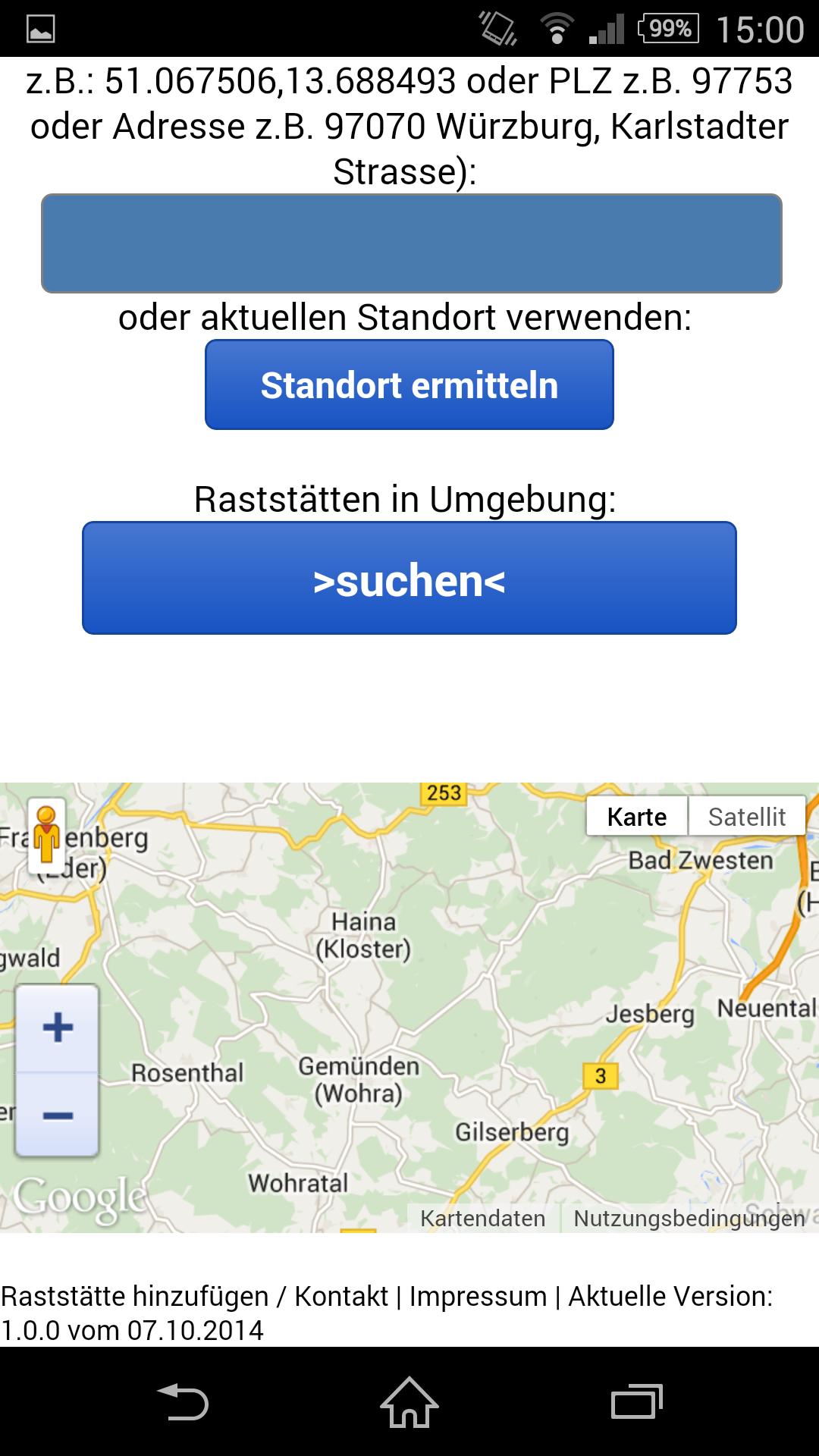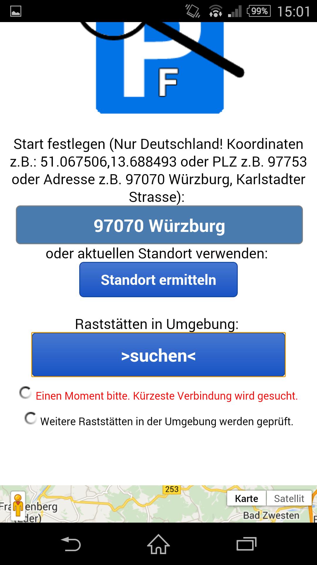 - Затем выберите> Выберите и подождите. Все доступные зоны отдыха в настоящее время разыскиваются рядом с водителем, и их удаление и их доступное количество парковочных мест воспроизводится. Выбранный маршрут также отображается под Googlemaps ниже и, таким образом, сопровождается снова графически.