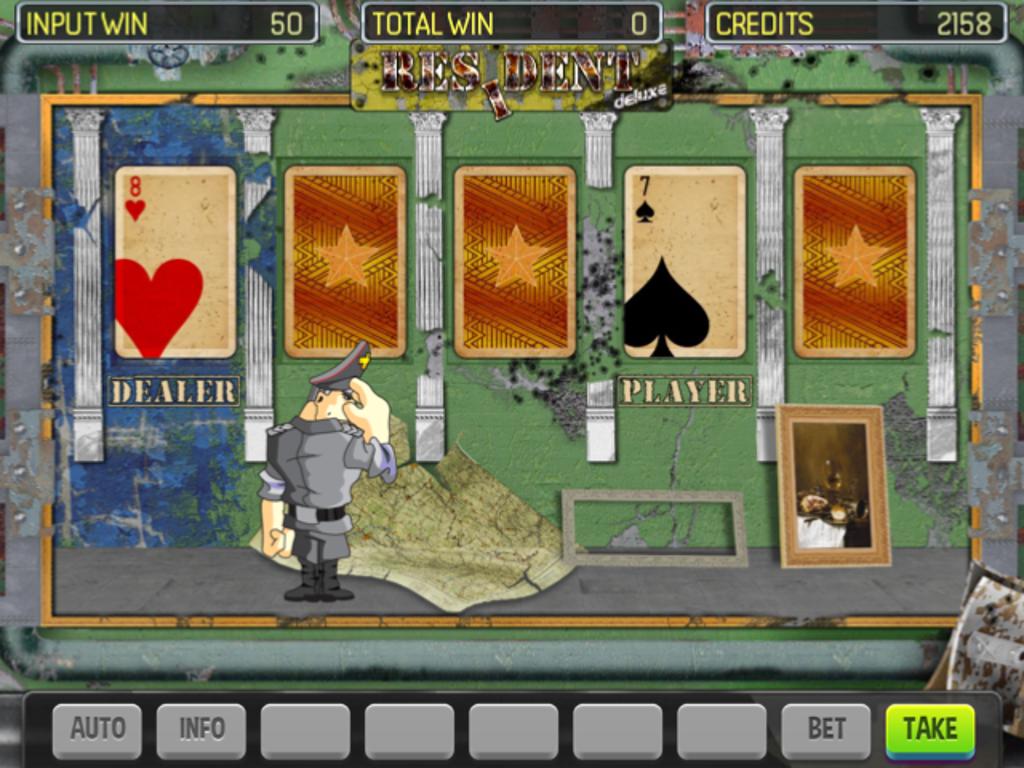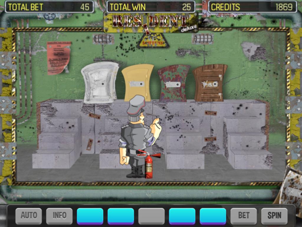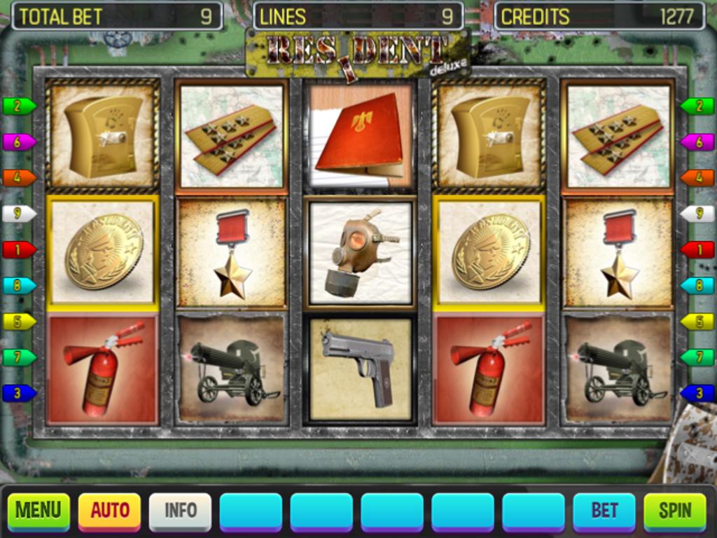 Resident Deluxe игровой автомата подтверждает его дизайном, что вы должны стать офицером военной разведки, который перешел в вражеские задние районы. На барабанах пользователи могут заметить оружие, пулеметы, отметки плеча, медали и другие символы, которые передают соответствующую атмосферу.