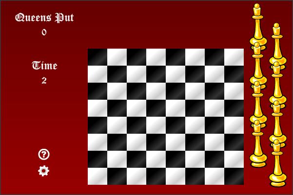 Можете ли вы принести мир на шахматную доску, поместив восемь королев на доску, но не допустить их захвата? В этой игре вам будет предоставлена ​​стандартная шахматная доска, и 8 королев будут размещены справа от доски. Согласно правилам шахмат, королева может захватить еще одну часть на той же линии в вертикальном, горизонтальном или диагональном направлении. Вы можете щелкнуть и перетащить кусочки и поместить их на доску, но обратите внимание, что их нельзя удалить после урегулирования. Королева не может быть помещена, если она находится на линии захвата другой королевы на доске. Количество королев, которые вы поместили, и количество проведенного времени записано слева от экрана. Когда больше не может быть сделано, игра заканчивается. Завоевать королевы и выиграть их верность!