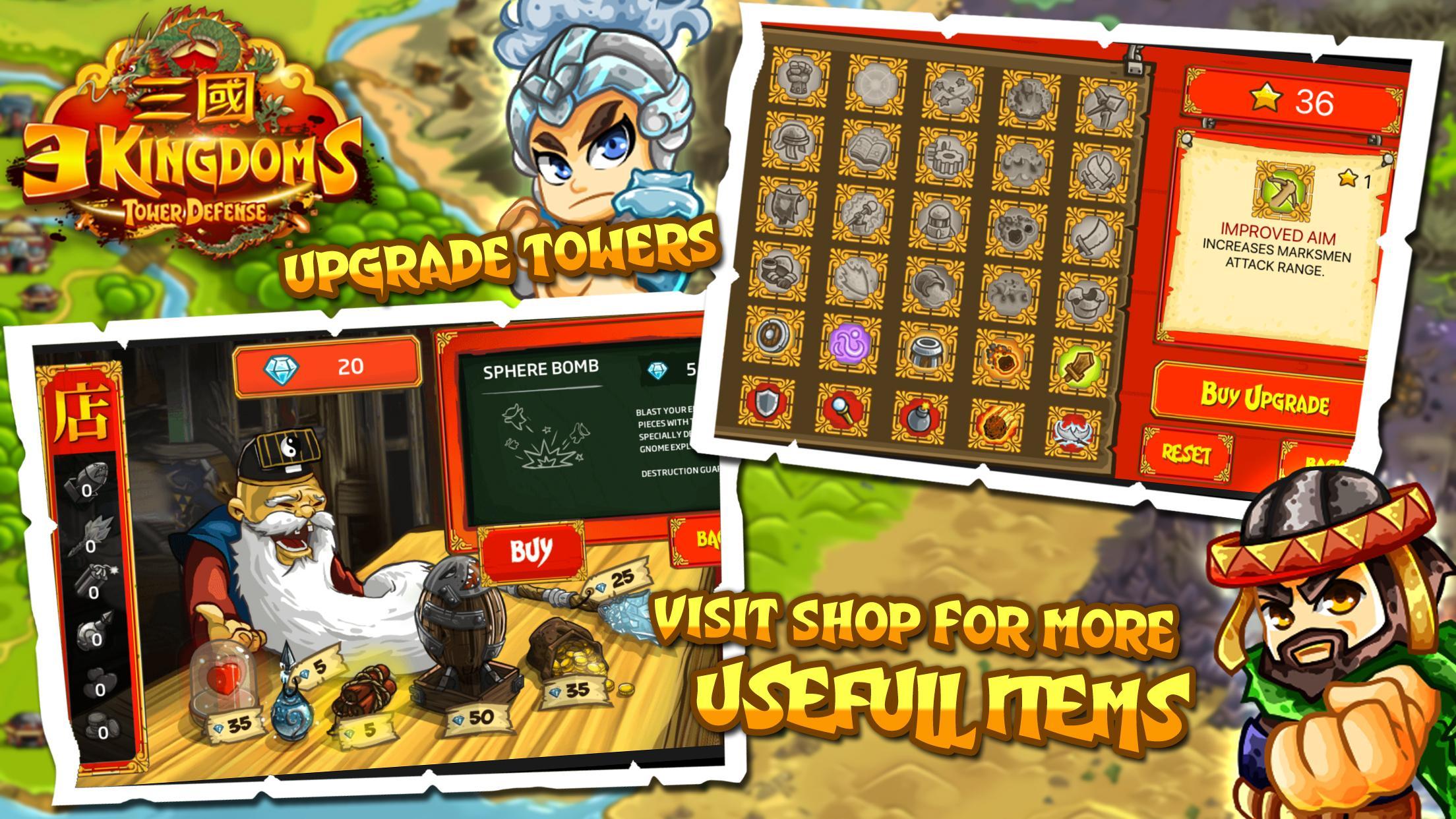 Будьте готовы использовать оборонительную стратегию с башнями, которые вы можете модернизировать, и специальным оружием. Защитите свое королевство от орд желтых повязок, злых волшебников, грабителей, повстанцев, войск Цян и многих других врагов, которых нужно победить! Битва произошла на территории Китая, и нам нужны такие герои, как вы, чтобы стать легендой мира трех королевств!