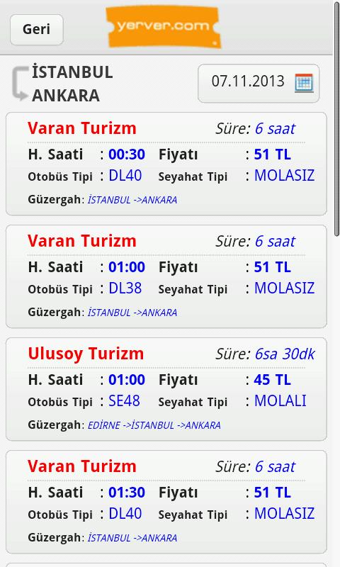 Yerver ; Вы можете проверить билеты на межгородство шины, внутренние и международные билеты на полеты из приложения, вы можете выбрать нужную компанию Transporter, которую вы хотите, и купить эти билеты мгновенно или сделать бронирование. Вы можете продолжить процесс на веб -сайте Yerver .com в рамках этой программы. Вы также можете сделать наоборот. Ваши транзакции выполняются в Интернете.