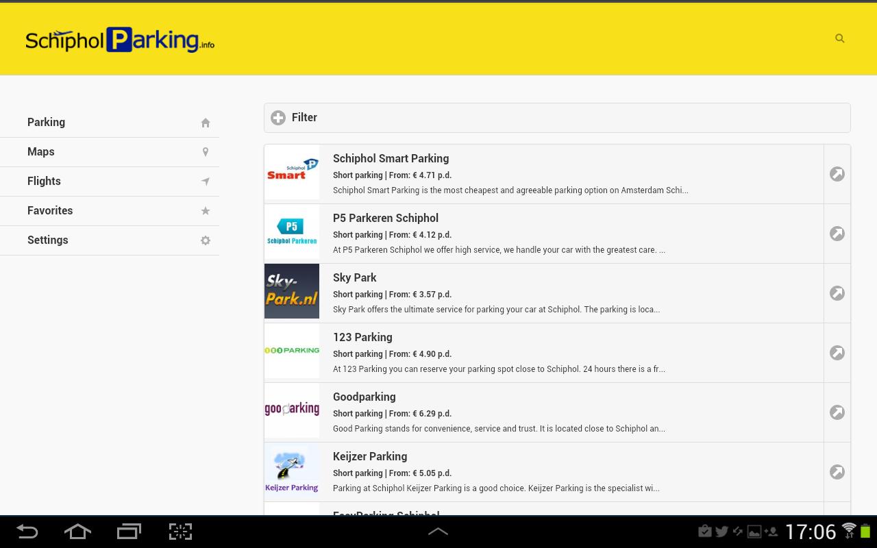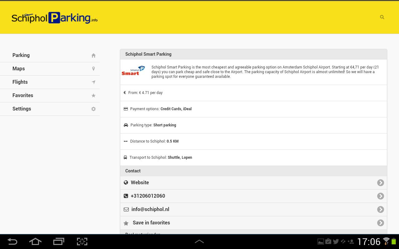 With the app from SchipholParking.info you can get all the details of all Schiphol Airport parking providers, save them to your favorites and view their address on maps.