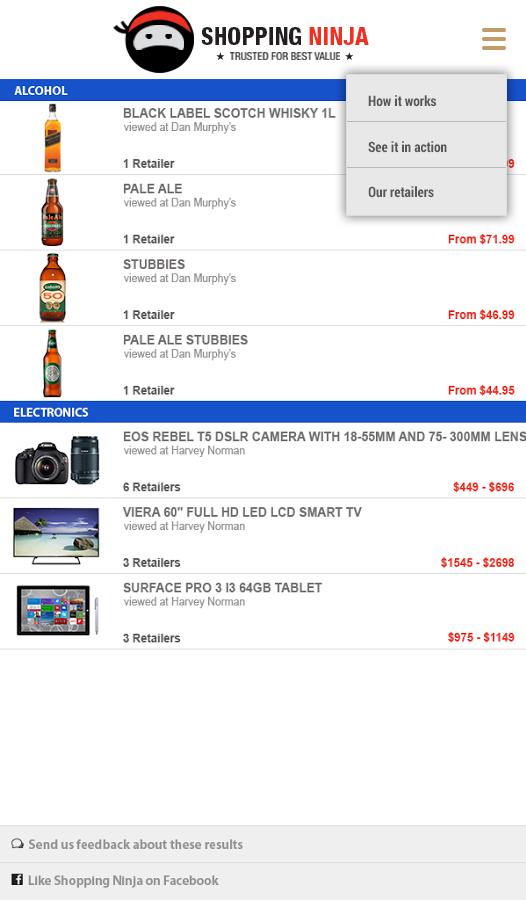 We cover over 100,000 products from all the major retailers and brands across TVs, cameras, computers, fridges & freezers, washing machines, vacuum cleaners, dishwashers, mobile phones & tablets as well as wine, beer, spirits, whisky and champagne. You can trust Shopping Ninja for the best value every time.