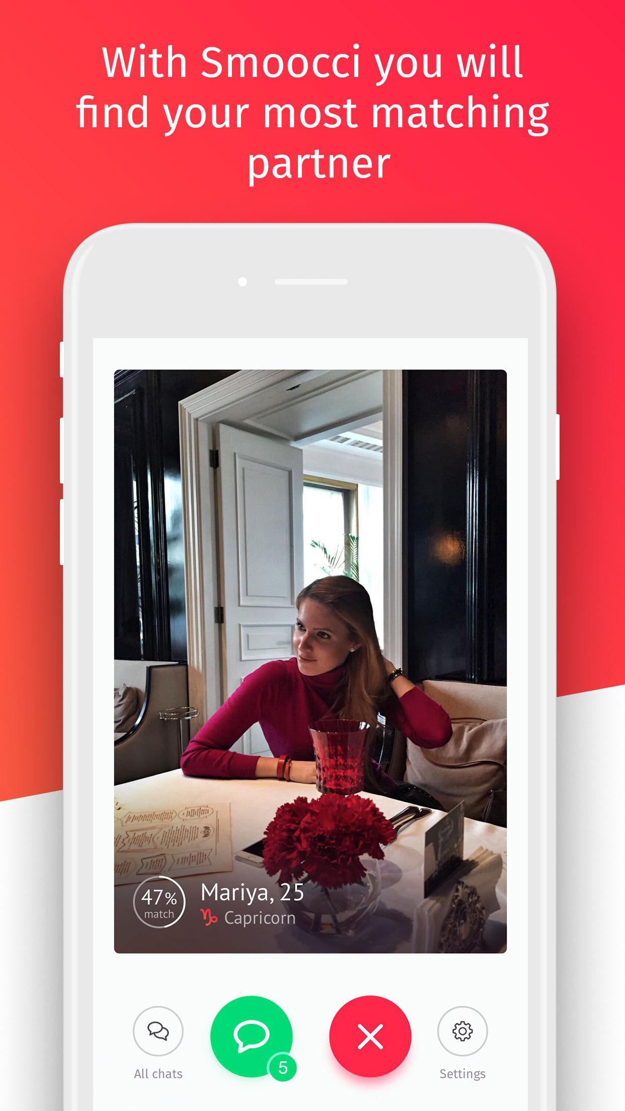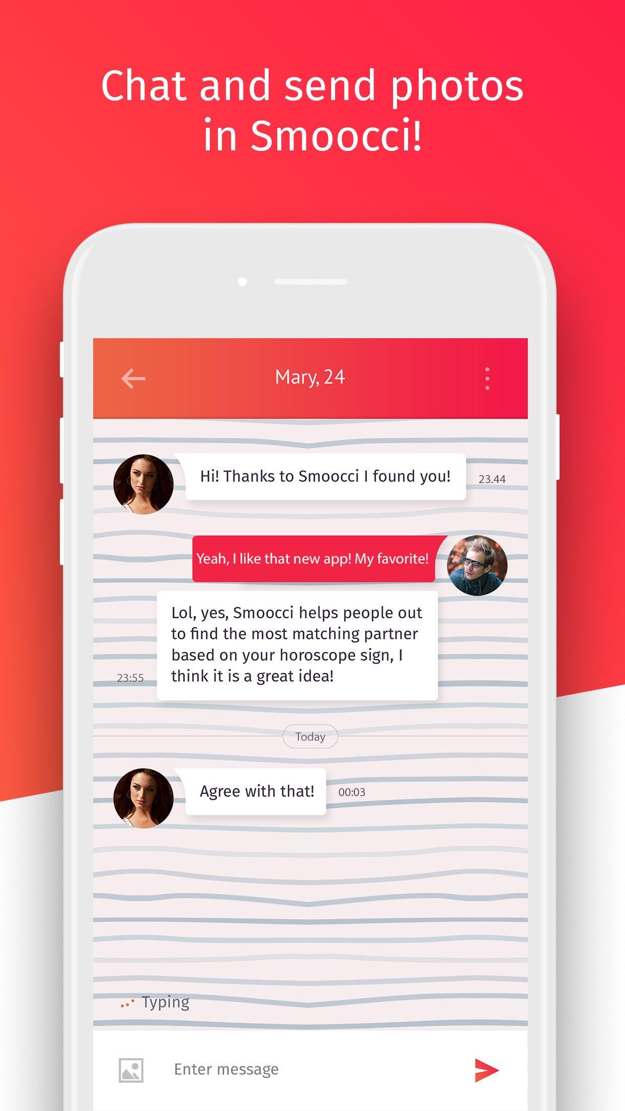 Smoocci is a unique dating app that will find your perfect match based on your horoscope sign! Smoocci's algorithm provides the most matching candidates from the whole data base, so there is no need to like the person and to wait for the like back as these people are already a good match for you! Just start chatting straight away!