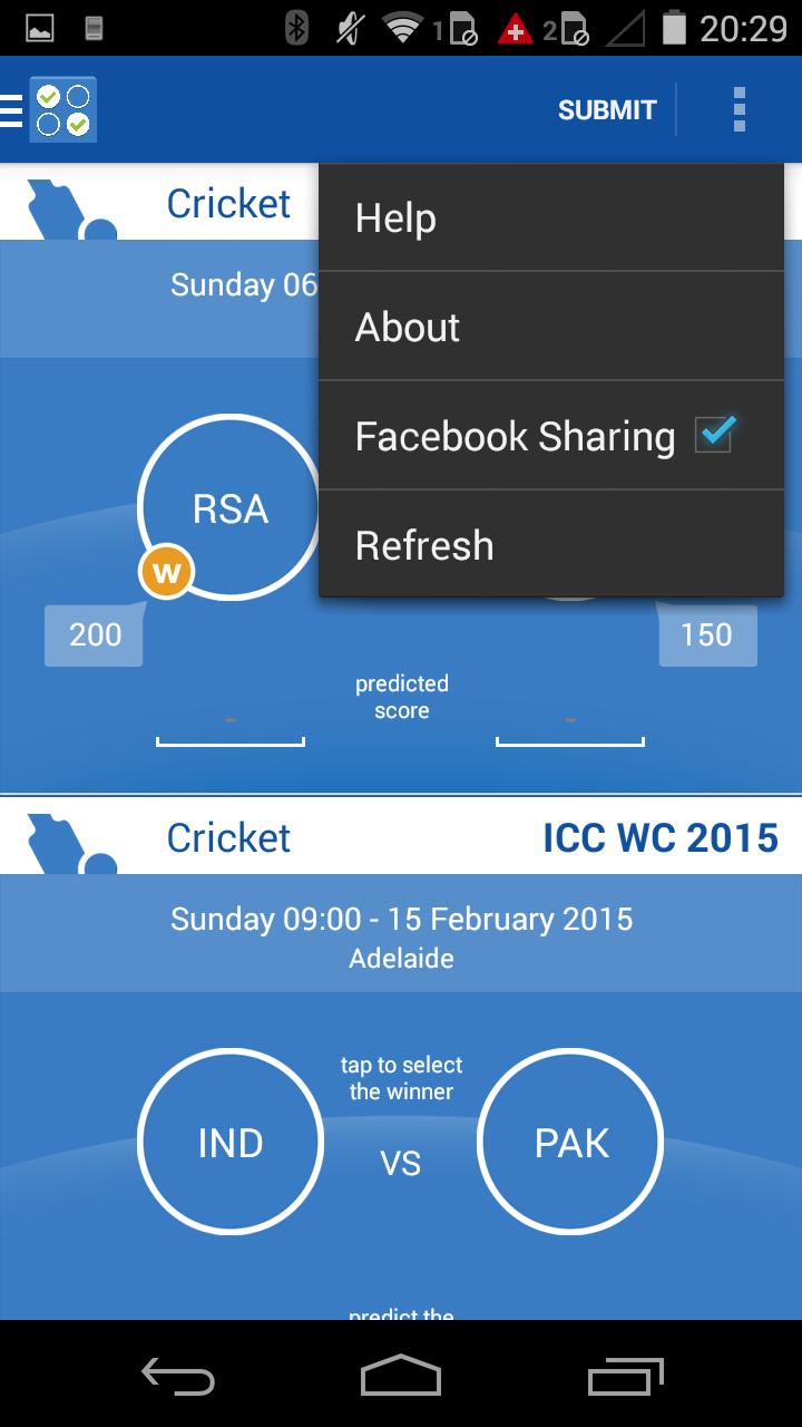 You may or may not predict the score or winner of any match, but predicting a score/winner will help you improve your standings. Submitting predictions, prompts you to share it on Facebook.