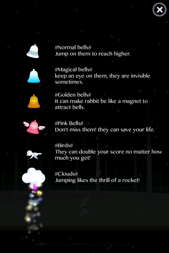 Bells Jump เป็นเกมกระโดดแบบคลาสสิก กระต่ายตัวน้อยน่ารักกระโดดขึ้นไปบนระฆังเพื่อปีนขึ้นไปพร้อมกับเพลงพื้นหลังที่สัมผัสได้ผู้เล่นอย่างช้าๆแช่อยู่ในความเงียบของโลกหิมะที่ขี้เล่น