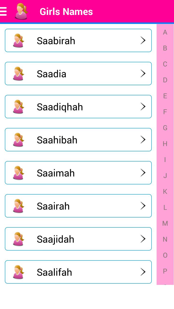 คอลเลกชันของชื่ออิสลามสำหรับเด็กมุสลิม (เด็กชายและเด็กหญิง) ที่มีความหมายภาษาอังกฤษกราฟิกที่น่าดึงดูดและมีสไตล์แอพนี้ยังอนุญาตให้สร้างรายการชื่อโปรดของคุณสำหรับเด็กชายและเด็กหญิงและคุณสามารถแบ่งปันชื่อใด ๆ กับเพื่อนและครอบครัวของคุณทางอีเมลข้อความ SMS หรือสิ่งที่คุณต้องการ เป็นทางออกสำหรับพ่อแม่ของโลกมุสลิมที่กังวลในเวลาที่ทารกเกิดเกี่ยวกับชื่อของเขา/เธอเพียงดาวน์โหลดแอปพลิเคชันฟรีนี้และใช้เพื่อค้นหาความหมายของเพื่อนและชื่อครอบครัวของคุณและเพื่อจุดประสงค์ในการเกิดชื่อทารกใหม่ของคุณ
