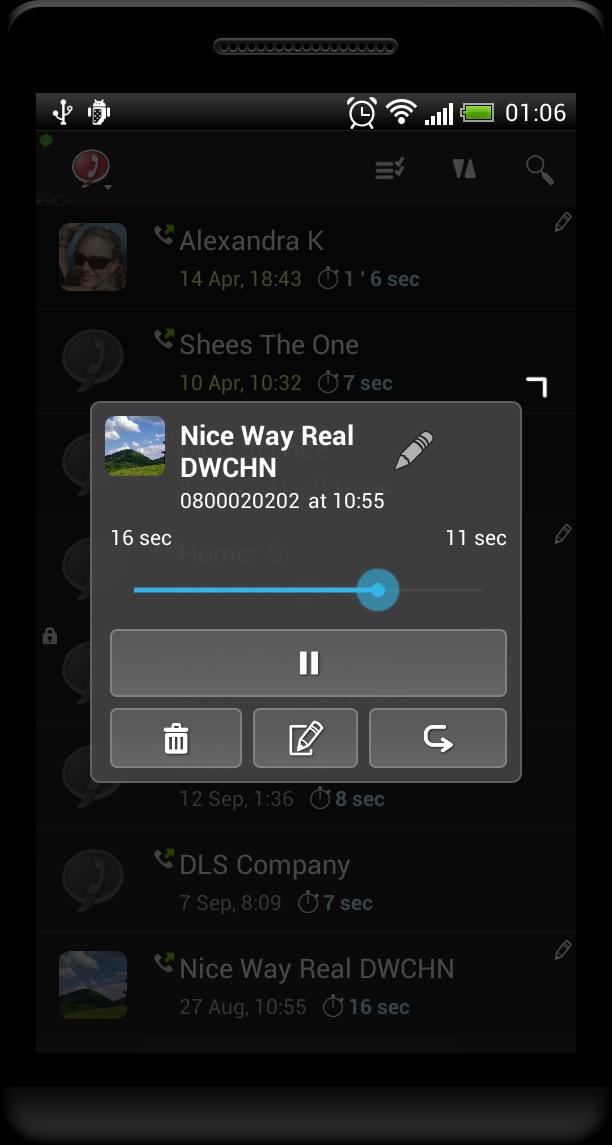 ต้องจดบันทึกขณะโทร? เขย่าโทรศัพท์ของคุณและเริ่มบันทึก อีกคนหนึ่งในการโทรให้หมายเลขที่อยู่คำแนะนำหรือข้อมูลสำคัญอื่น ๆ แก่คุณหรือไม่? เขย่าหรือกดปุ่ม เพื่อเริ่มการบันทึก ตั้งชื่อบันทึกของคุณเรียงลำดับค้นหาลบ บันทึกการโทรโดยอัตโนมัติโดยใช้ตัวกรอง สร้างบันทึกเสียง บันทึกการโทรทั้งหมดใช้ปุ่มบันทึกลอยตัวและคุณสมบัติอื่น ๆ ที่มีอยู่ในเวอร์ชัน Pro (ซื้อในแอป)