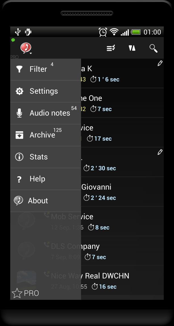 ด้วยเวอร์ชันมืออาชีพคุณจะได้รับคุณสมบัติเซ็กซี่หลายอย่าง: เพิ่มข้อความบันทึกสำหรับการบันทึกแต่ละครั้ง - คุณสามารถเขียนได้อย่างสะดวกสบายขณะฟังบันทึกและแชร์โดยตรงหรือโทรหาถ้าโน้ตเป็นหมายเลขโทรศัพท์ คุณจะได้รับทางเลือกอื่นในการเริ่มบันทึกอย่างสะดวกสบาย - ตัวอย่างเช่นเมื่อโทรศัพท์ของคุณอยู่บนโต๊ะทำงาน - ด้วยปุ่มบันทึกลอยตัวบนหน้าจอการโทรของคุณ ตั้งค่าการเก็บถาวรอัตโนมัติสำหรับบันทึกเก่า (การตั้งค่า 1 ถึง 31 วัน) และจัดเก็บรายการบันทึกของคุณไว้ ในช่วงเวลาที่วุ่นวายเปิดใช้งานตัวเลือกบันทึกการโทร เพื่อเพิ่มความเป็นส่วนตัวของคุณให้ตั้งค่าพินแอป และหากคุณต้องการสำรองหรือถ่ายโอนให้ส่งออกการบันทึกไปยังไฟล์ซิปที่เข้ารหัสรหัสผ่านได้อย่างง่ายดาย