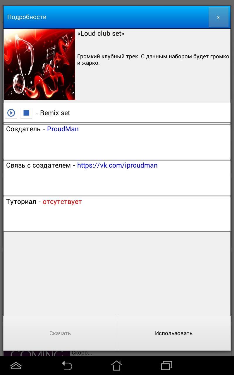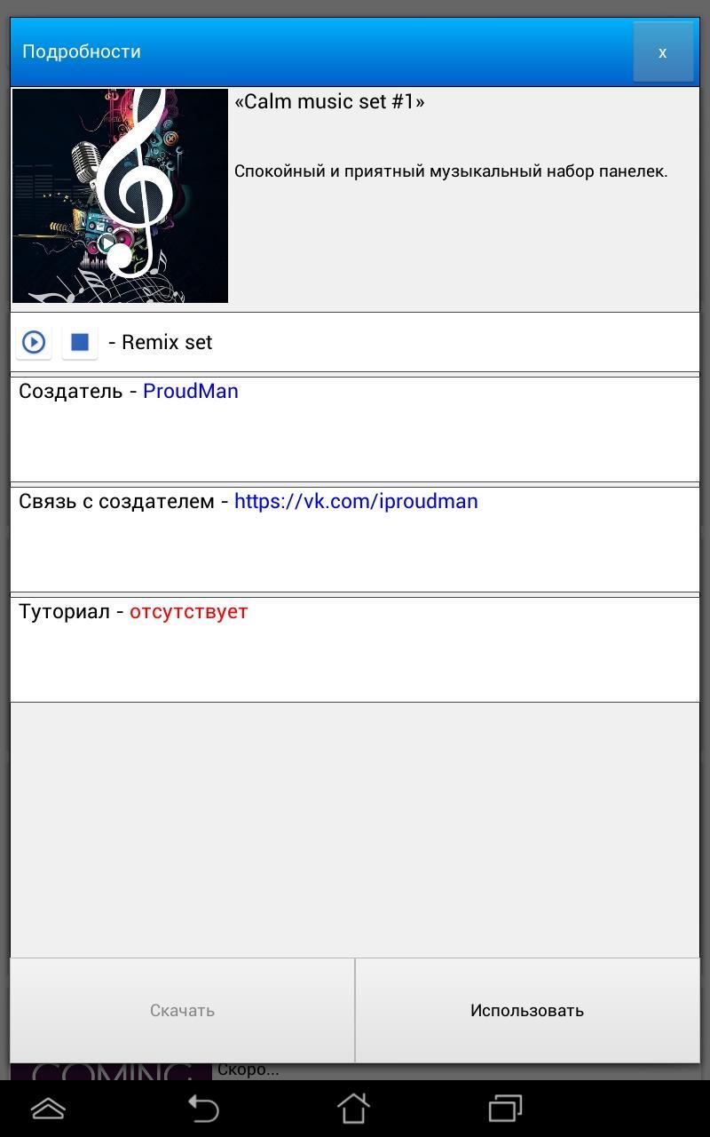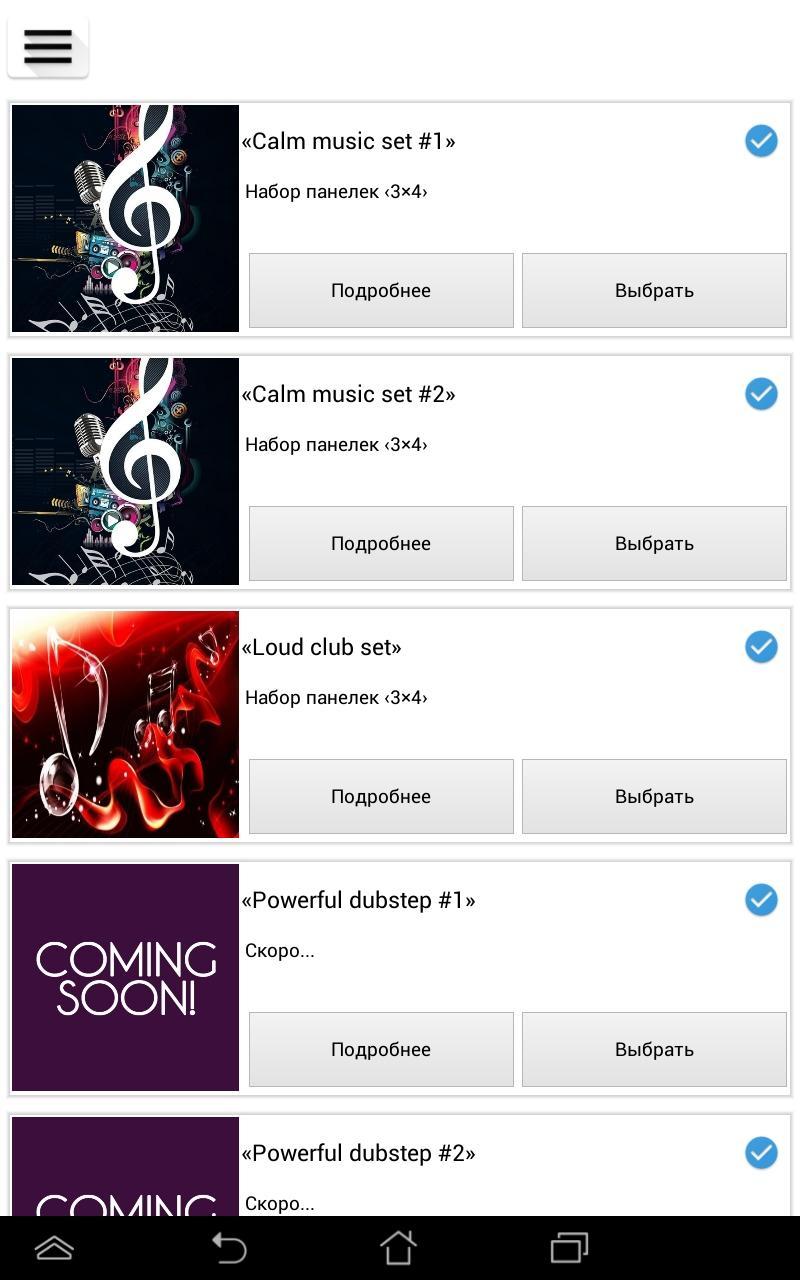 นอกจากนี้ในแอปพลิเคชันมีหน้าต่าง "ชุด" ซึ่งคุณสามารถเลือกชุดเสียงสำหรับโหมดมาตรฐานรวมถึงฟังชุด