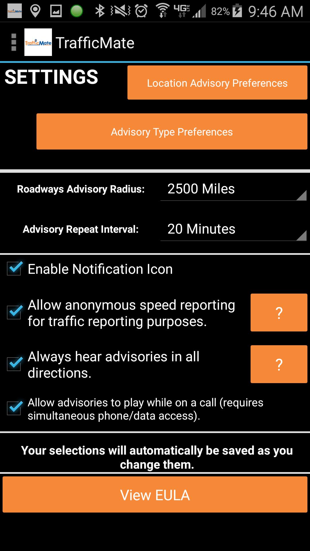 The application will remain on while you drive, broadcasting any travel alerts for reported conditions within a set mile-range (that you can set for yourself) of your current location. If your phone is able to provide a high enough GPS precision, we will only notify you of advisories in your direction (you can change this in your settings to provide all directions, all the time!).