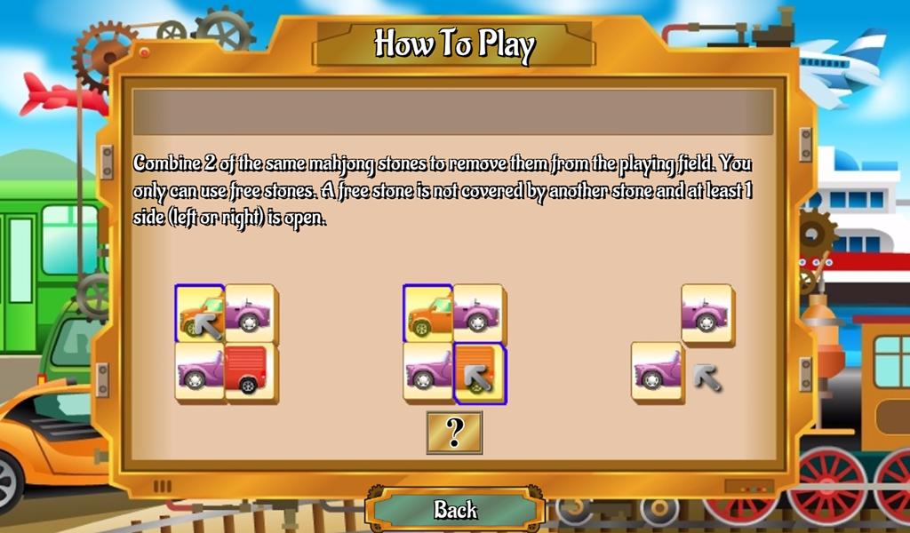 In Transport Mahjong, instead of combining 2 of the same free tiles, you need to find complementary images to complete a transportation vehicle. Combine 2 parts of the same car or the same plane or even 3 different parts of the train or rocket to complete the level.
