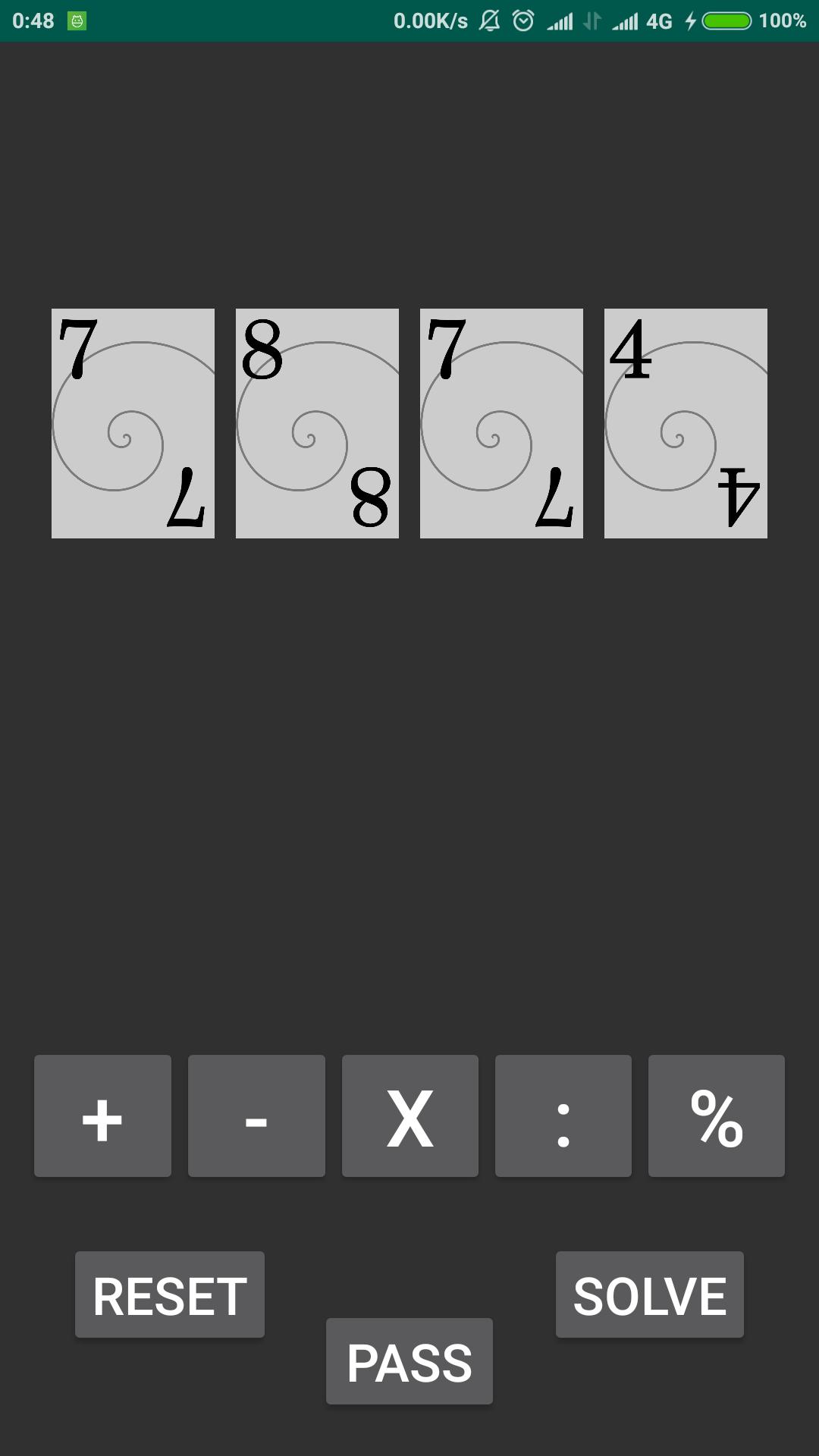 This is a Game where you get random four number and you need to use operators (Addition, Subtraction, Multiplication, Division, Modulo) to reach the 24, the goals of this game. If it is not possible don't worry you can pass the round and get the points if it is actually can't be solved.
