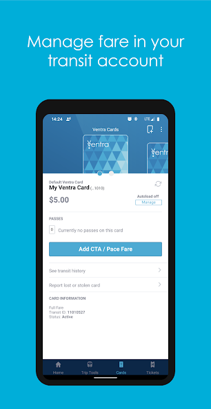 • Instantly load value or passes to your Ventra Card's transit account.