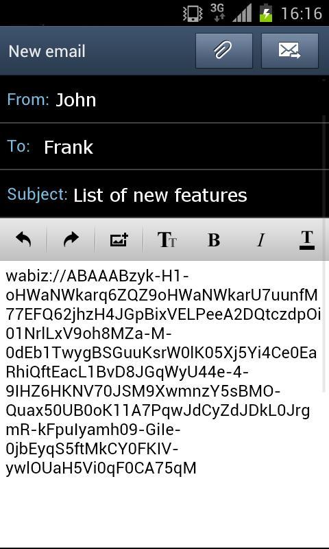 You can also backup your confidential notes securely. Wabiz encrypts any text you want (notes, Credit Card numbers, etc.), which you can then store encrypted on your device using other apps.