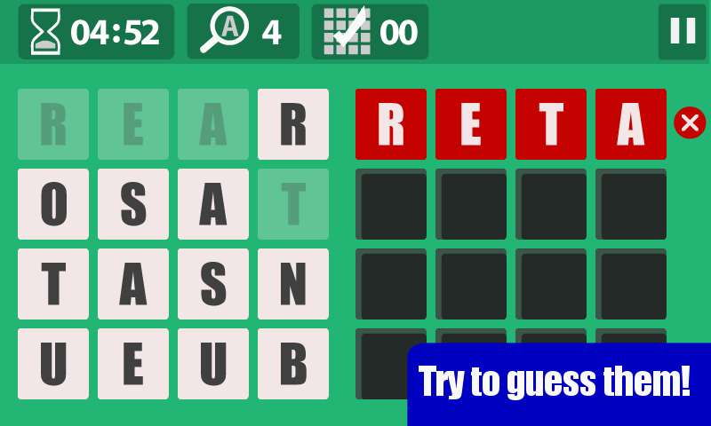 4个单词,4个字母,每个字母在屏幕的左侧混乱。点击字母以形成右侧的单词 - 并快速:您只有5分钟即可找到解决方案!
