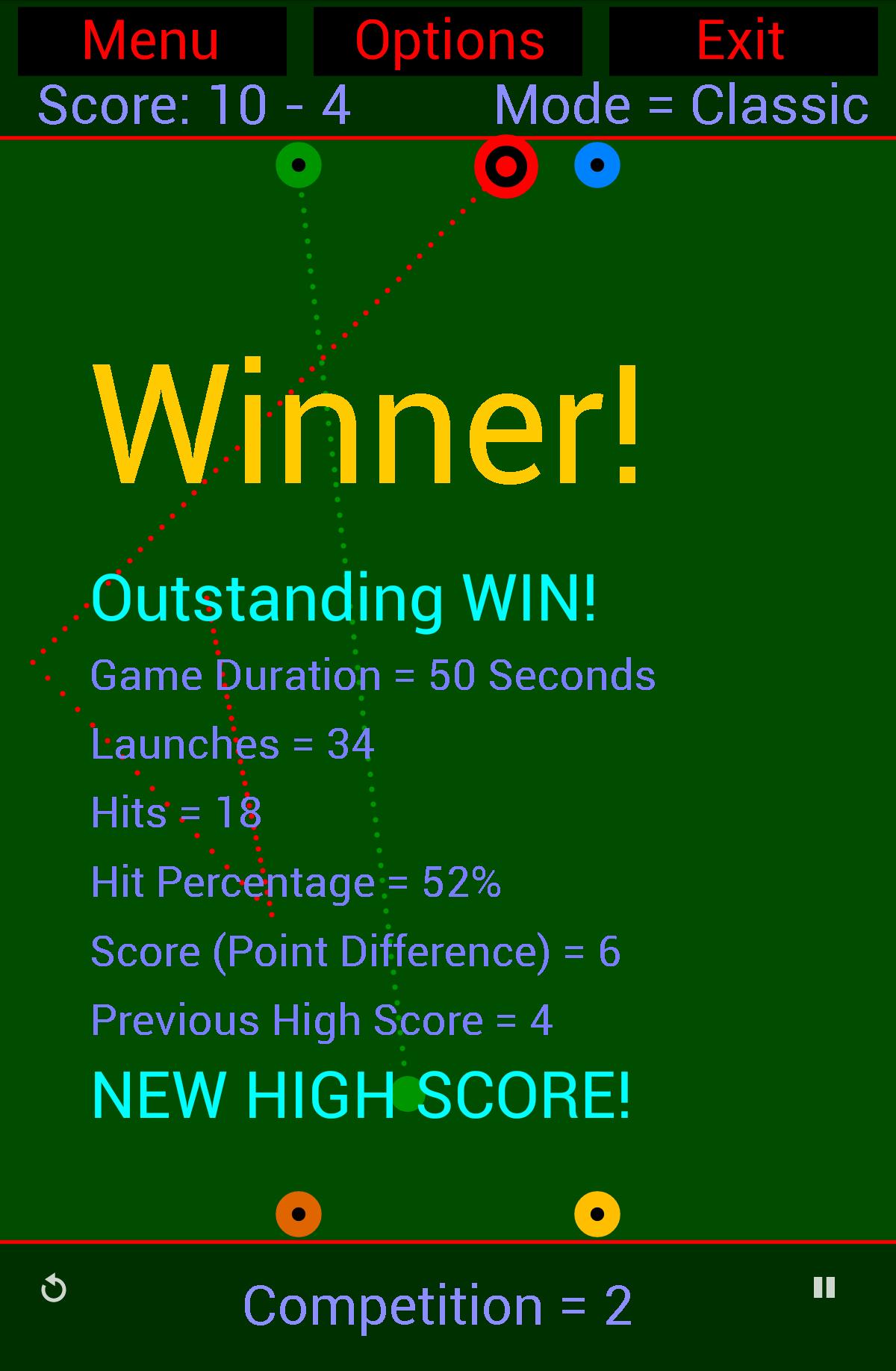 您必须点击屏幕以将球从黄色的家园发射到您认为目标球所在的位置。当您触摸屏幕时,您将定义一条线,该线将黄色的球从黄色的基部来源到您触摸的点。您发射的球以及其他三名球员发射的球可能会与目标球和彼此相撞,从而导致模拟物理定律的轨迹。