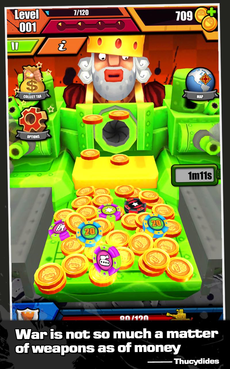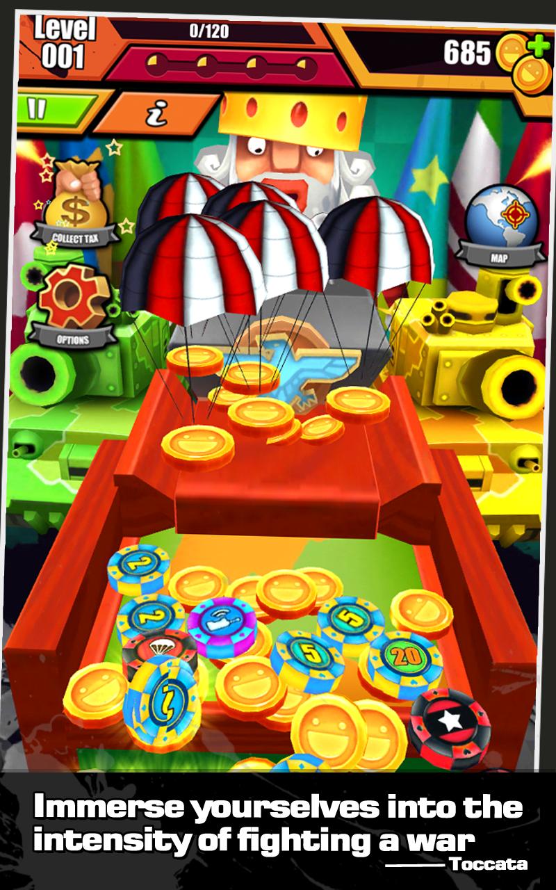 Coin Pusher - War and Fame是最好的硬币推动器游戏,结合了模拟战争的要素。您可以使用硬币推动者赚取足够的硬币来建立军事力量以占领世界。