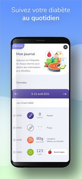 在跟踪日记中记录您的餐点,血糖测量和胰岛素剂量,并保留所有数据的历史记录。