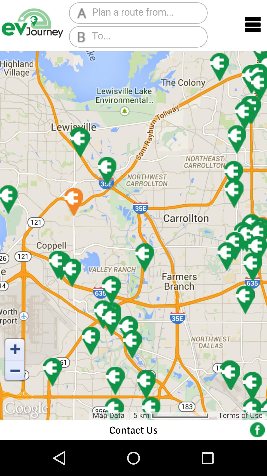 要使用EVJourney路線計劃者,請輸入起始地址和一個結尾地址。建議的路線將顯示在地圖上。電動汽車充電站靠近該路線作為標記。