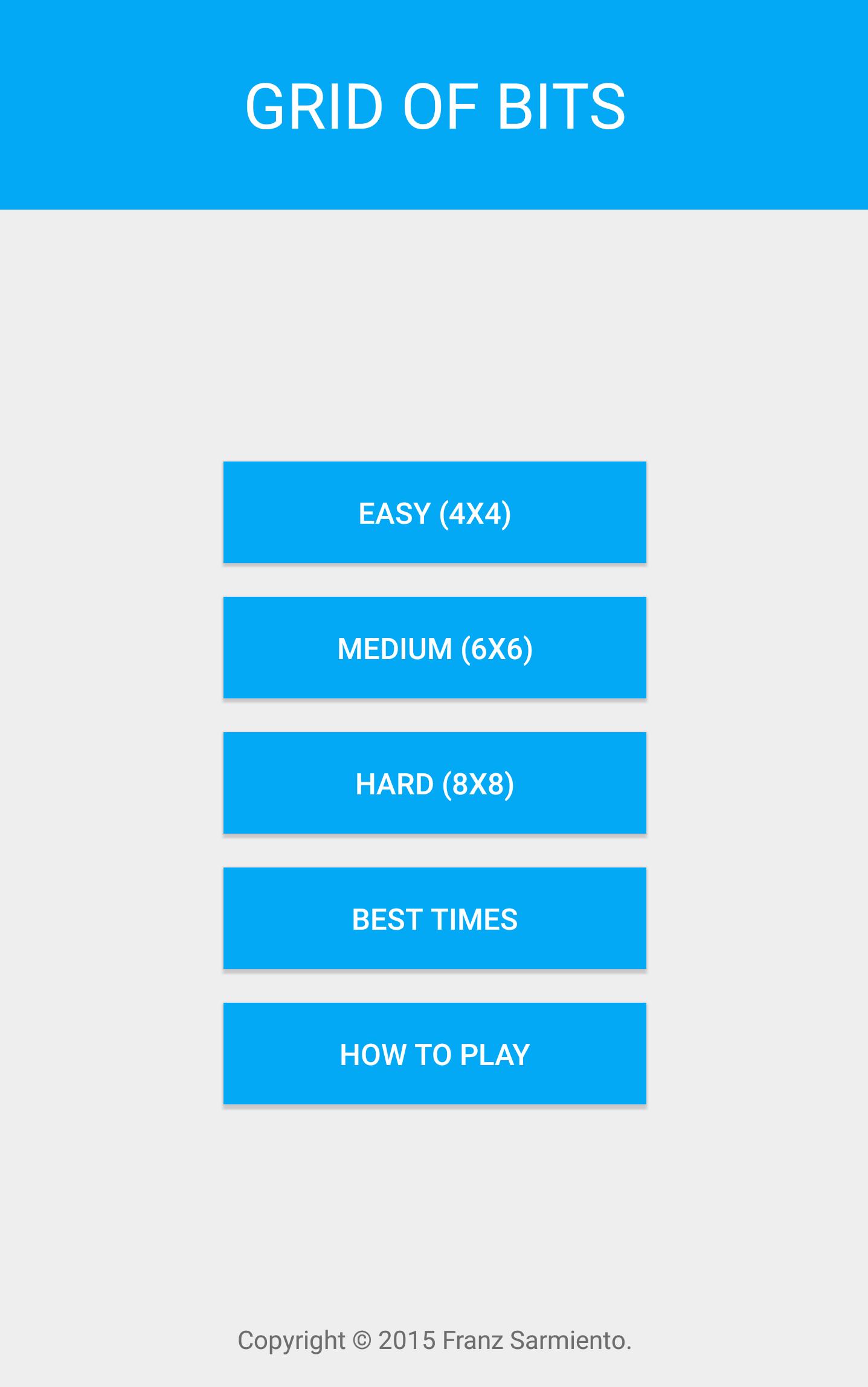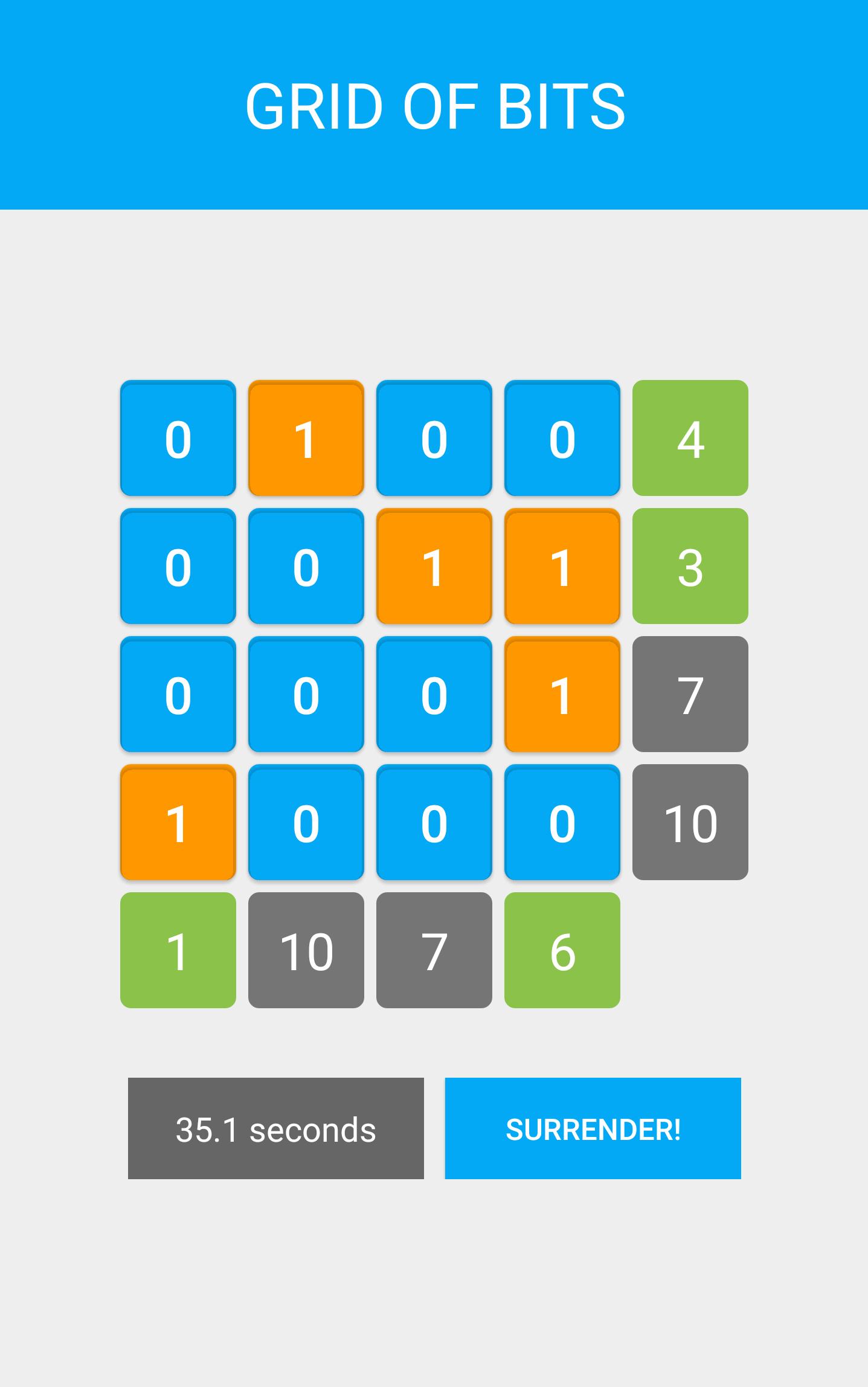 Grid of Bits是一個遊戲,您可以在網格的每個單元格中切換位置。找到在每行末尾找到的小數數字的正確二進製表示形式,以贏得遊戲!