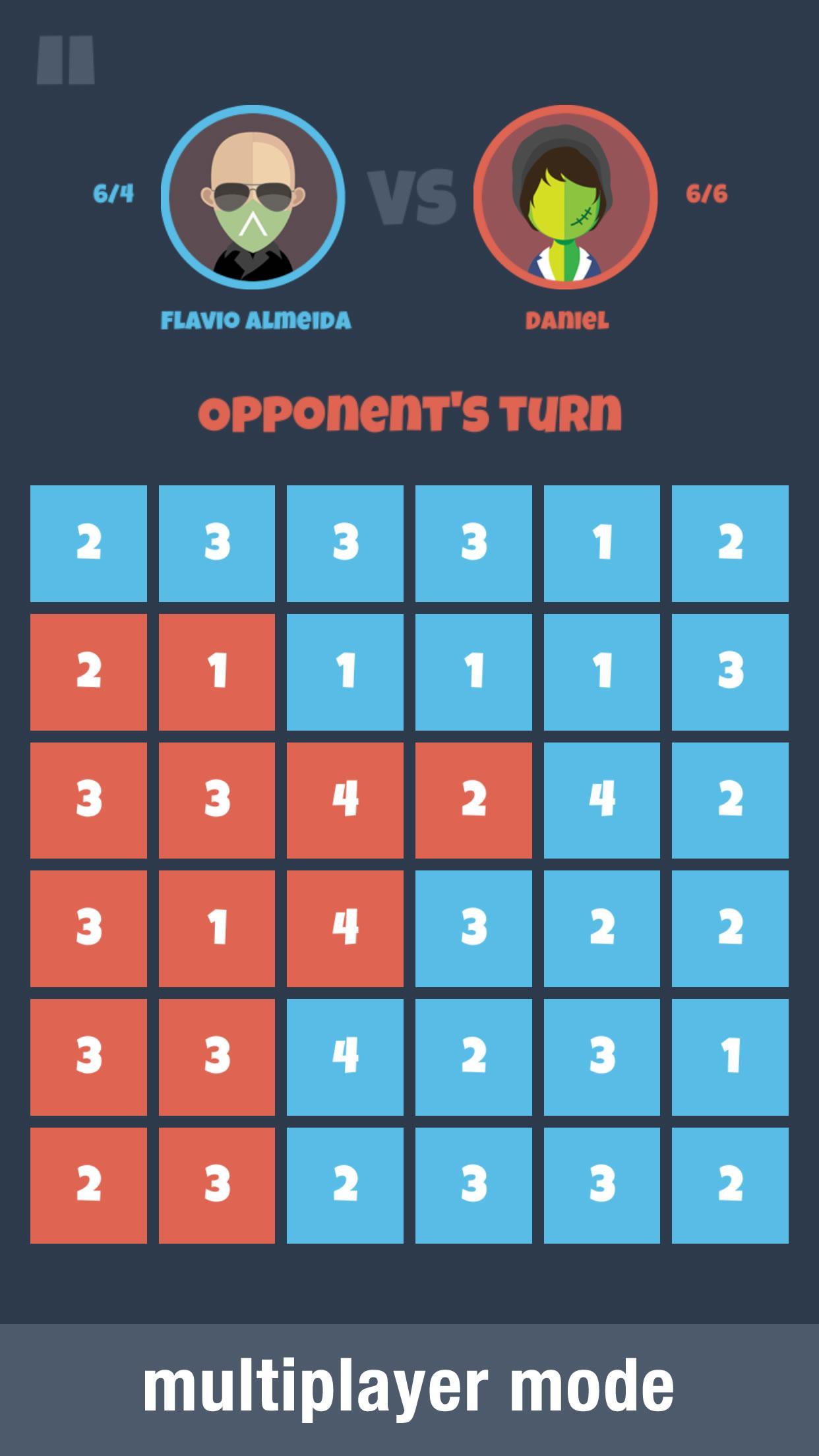 H2H是一款令人上癮且具有挑戰性的遊戲!!!兩名玩家(或計算機)輪流將其貼上各自顏色的瓷磚在遊戲板上演奏,獲勝者是第一個佔據所有帶有瓷磚的正方形的玩家。