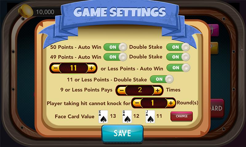 Tunk(俗稱Tonk)是一款快速節奏的紙牌遊戲,是一種敲打和杜松子酒的另一個有趣的變體。玩Tonk或Tunk遊戲有各種各樣的變化。在這個遊戲中,每個玩家將獲得五張牌,如果是49或50分,這是一次自動勝利,也有11張或更少或更少或13或更少或更少或15或更少的變化,這也是自動勝利。這有時被稱為tonk,tunk或敲門。在這種情況下,這隻手不進一步踢球,所有其他玩家的基本股份是49或50的球員的兩倍。如果玩家有13、12、11或更少,則付款是基本股份的三次。另外,如果玩家擁有9個或更少,則可以贏得特殊的勝利,那麼玩家將獲得基本股份的四倍支付。離線TONK - Tunk卡遊戲使您可以根據可取的變化設置遊戲變體,支出和所需的遊戲。