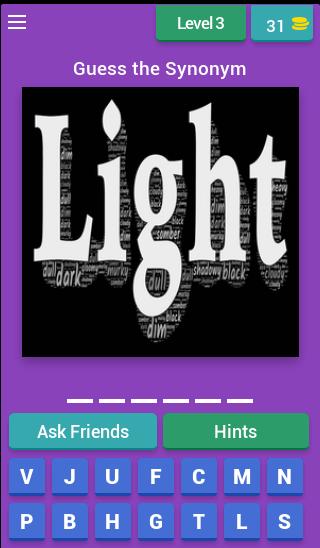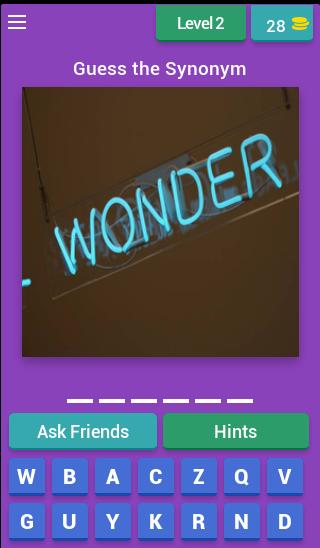 您的大腦過熱嗎? :)不用擔心,在Synonym Match中,我們提供了幾種方法來幫助玩家回到正軌,例如顯示一個正確的字母,刪除錯誤的字母或透露正確的答案。您也可以通過共享遊戲來獲得硬幣。