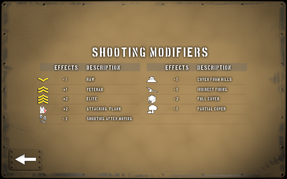 - 涵蓋地形效果,射擊修飾符和遠程武器的圖表。
