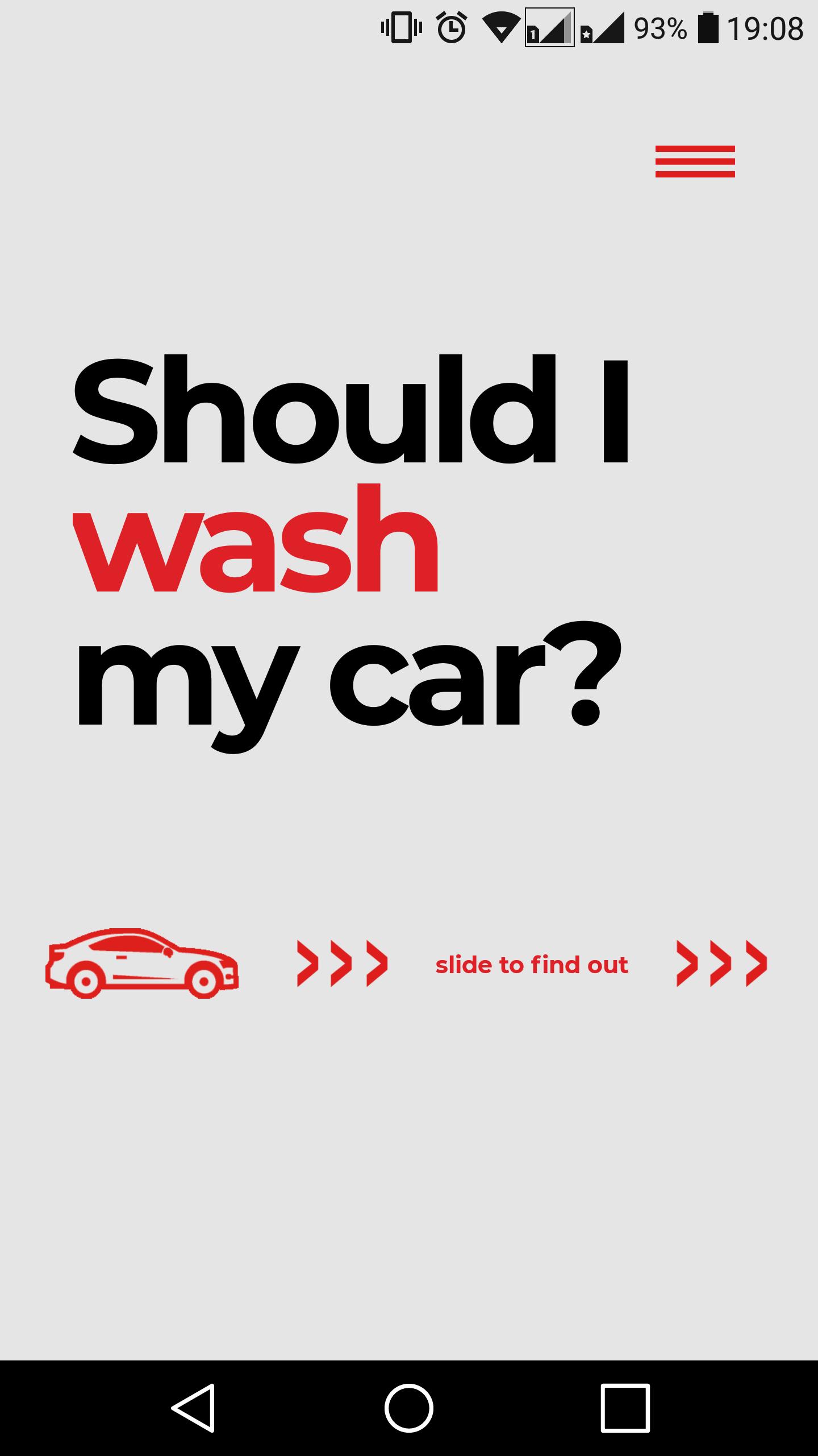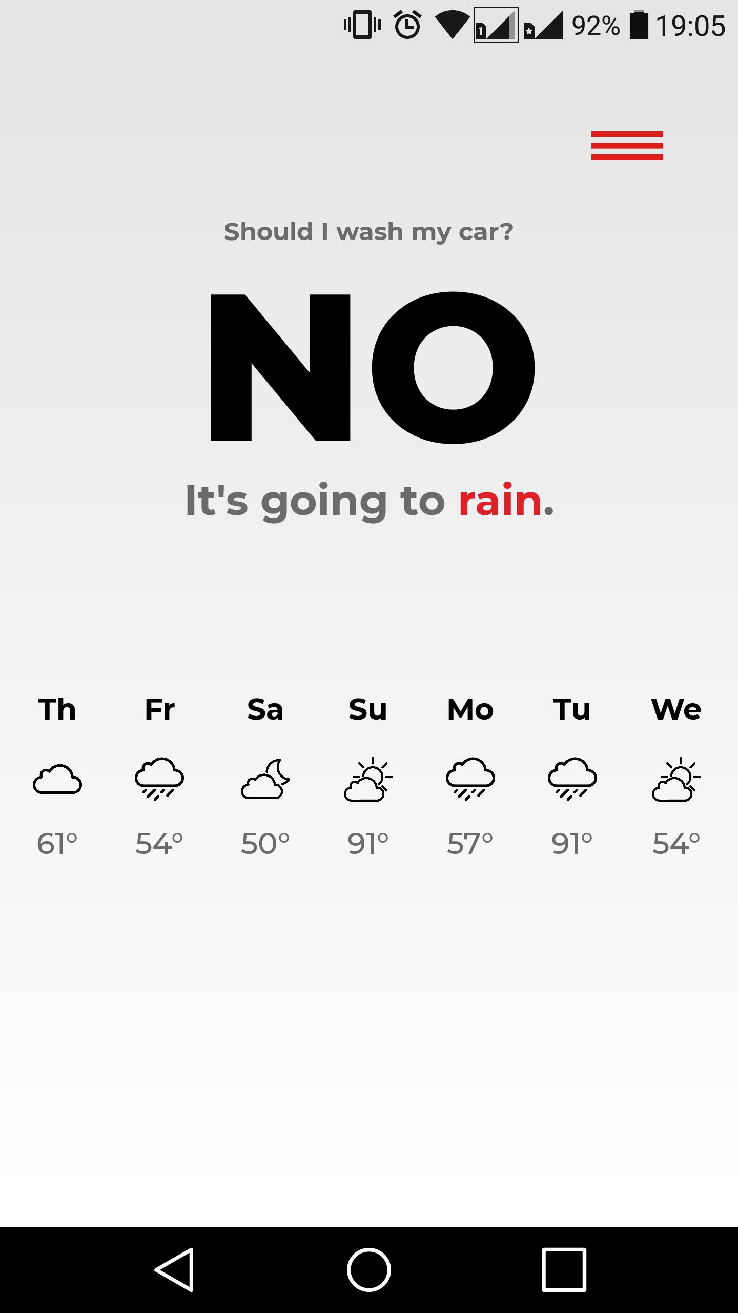 Washie的主屏幕提供了為期7天的預測,並為您提供了簡單的是或否,您是否應該洗車。如果安排下週下雨或下雪, Washie會警告您不要洗。